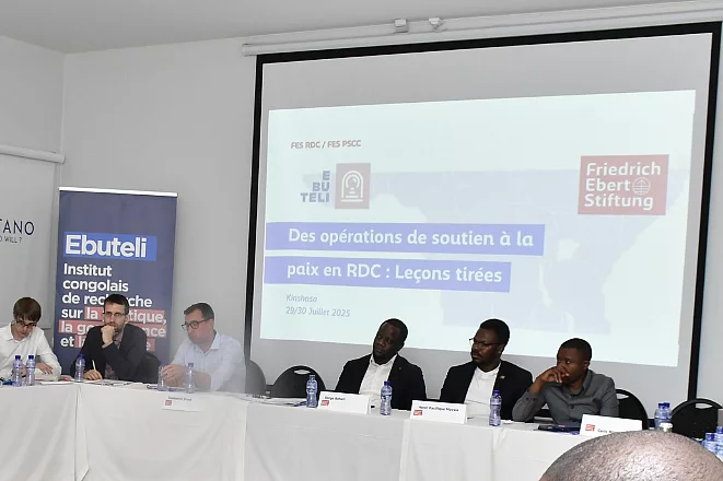 FES appuie les groupes de femme qui militent pour la paix et la sécurité à participer aux tables de discussions sur les négociations de paix du point de vue régional, elle accompagne les acteurs de la société civile dans le cadre de discussion sur le plan régional pour de réflexion sur la sécurité collective , qui implique les sociétés civiles des autres pays voisins de la RDC qui sont aussi exposés aux conséquences de conflit en RDC.